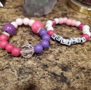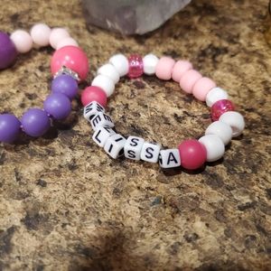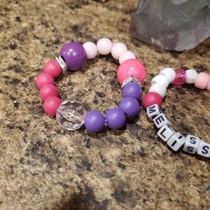 Personalized little girl bubble gum beaded bracelet set. Comes with both. Cute pink, white and purple. Just message me what name you want or I will assume you want sent name in picture. Handmade. Super cute for your little girl.