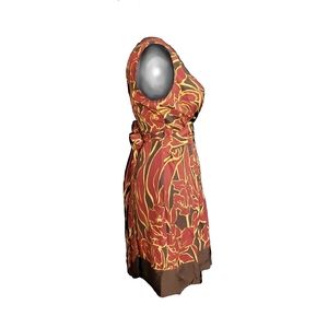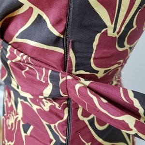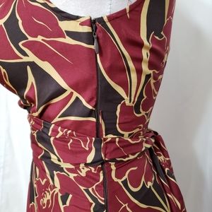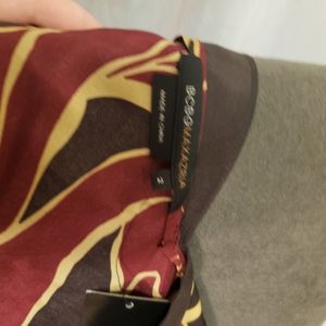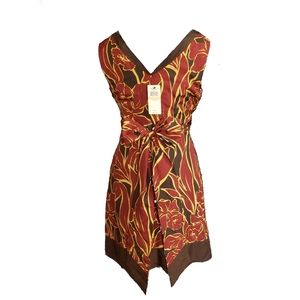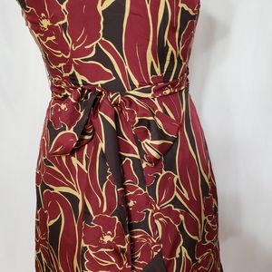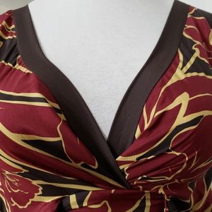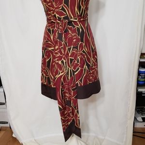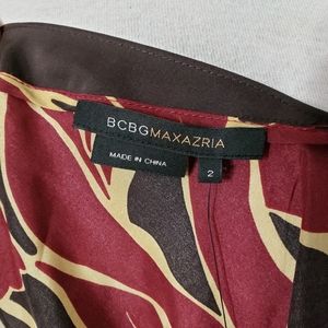 BCBG Silk faux wrap dress in burgundy, brown, and tan
