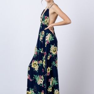 Navy Floral Print Strappy Open Back Maxi Dress. Adjustable neck tie. Elastic band under bust. Side slit. Lined to mid-thigh. New