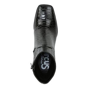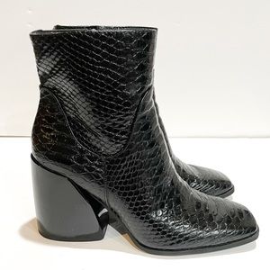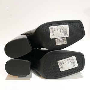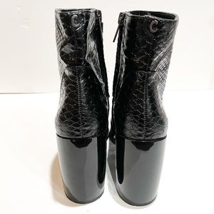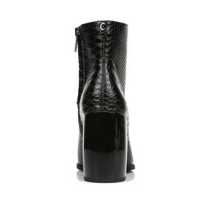 • Faux leather upper in a block-heel bootie style with square toe