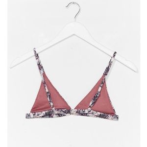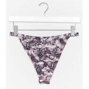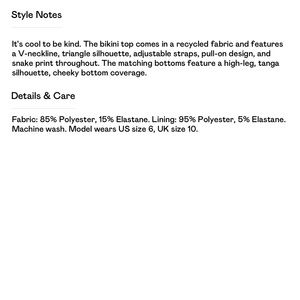 It's cool to be kind. The bikini top comes in a recycled fabric and features a V-neckline, triangle silhouette, adjustable straps, pull-on design, and snake print throughout. The matching bottoms feature a high-leg, tanga silhouette, cheeky bottom coverage