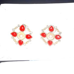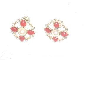 These are high grade costume jewelry with real coral enameled accents and tiny genuine diamonds in gold plated electro plate with a man made pearl in the center in a maltose cross type design with a gold lattice framework, these are delicate and refined but also have a hint of rocker chic in them which is why I want to keep them lol