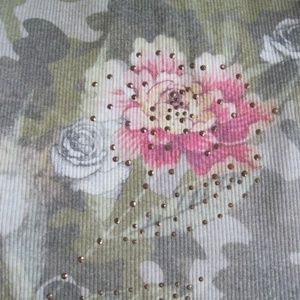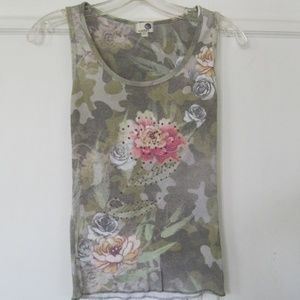 Tanks & tee by One World: dark brown features cute cap sleeve w/ gold stitching & "jeweled emblem" on front (100% cotton); sleeveless brown has pink "jeweled emblem" on front (100% cotton); sleeveless mix floral pattern has bronze "studs" on front (50% cotton/50% poly), Sz PS