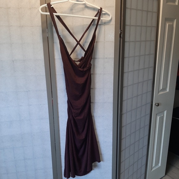 Burgundy dress, perfect for summer weather ties up in the back has a big v neck. Feels great on the skin.