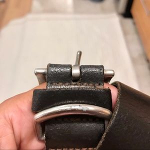 Brown leather and white metal buckle, brand signature on the metal, leather protection on the buckle, tonal stitching