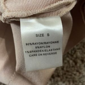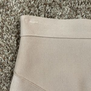 size small but really for XS sizes (!!), worn once, only can be dry cleaned, no flaws (stains) just a few pull marks from hangers (see pics) beige, but could be considered a ‘sand color). SUPER Tight and great material since it’s from HMS. priced due to pulls. Bodycon material