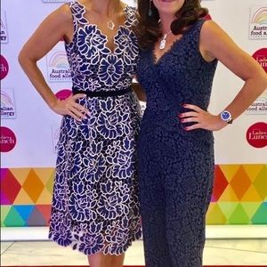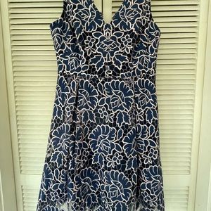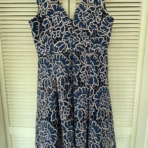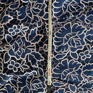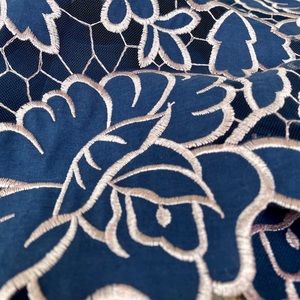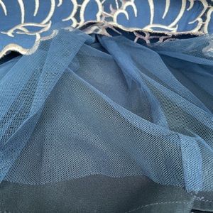 Large blue flowers appliquéd onto tulle with pale pink stitching.
