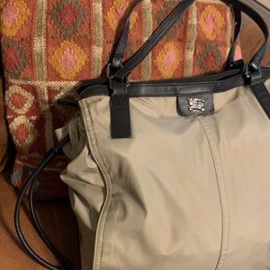 *****SOLD on crossposted site****Authenticated Burberry Buckleigh Nylon & leather . Light olive,black leather. Clean, beautiful condition, very minor signs of use- wear on handle in pic,backside fabric has small puckered area , not really noticeable but could be steamed. This spacious carryall is lined inside with the iconic Burberry red, black & tan plaid print. Zip top closure. Ruched side with leather drawstrings.