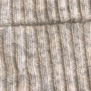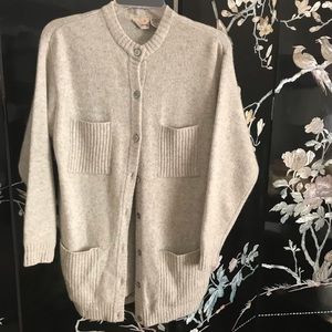 This sweater has mixed cream and grey yarn. It is soft, has 2 pockets on each side. 70% lambs wool 20% angora 10% nylon Dry clean only. *note small hole on the bottom that I can repair and add the results.