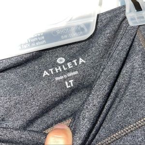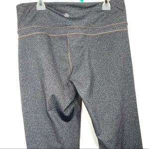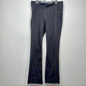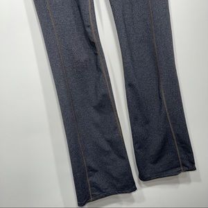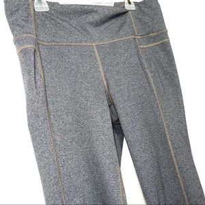 Excellent condition! Very flattering fit! Dark gray heather fabric with tan stitching. Fabric is 45% Nylon Supplex, 42% polyester and 13% Lycra. Has a hidden waist pocket.