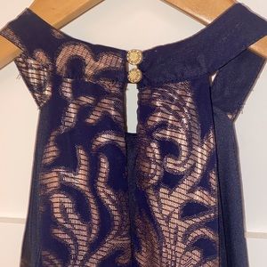 Perfect condition navy and gold metallic dress, pretty detailing, size small, from Francesca’s!