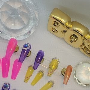Gel long cuffin 💅 jelly nail polish gel nails cured in led lamp all prep work done so they'll last longer if properly applied comes with instructions on how to apply there press on that you can us over and over cotton candy colors jelly polish cured in lamp 5 purple stone 1 soiled purple 4 yellow stone 4 pink 6 orange color 20 nails 💅in all for a perfect fit all makkart nails (LOT2)