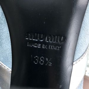 Miu Miu 38.5 Mary Jane heels silver grey leather & suede. Some scuffing as shown in photos but still good condition. Heel is approx 4.5” tall. Slip on style with buckle strap. Very cute piece. Made in Italy.