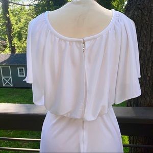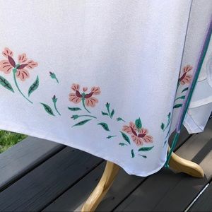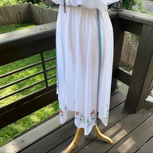 70s Vintage Handkerchief Jagged Hem Disco Summer Dress; Studio 54 Style Off Peekaboo/Sleeveless, Ankle Length, Pull On/Hidden Zip Back. Waist (has some elastic) Green & Purple Accent Tassel Strings. The dress is an off-white color with a beautiful thing to it that will give a iridescent look when it hits the light! Excellent Vintage Condition ~ No Flaws.