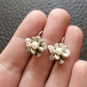 Beautiful sterling silver (marked and acid tested) earrings marked 925 Isreal with faux pearls- approx .85" long- normal age related patina (these have not been polished)- good condition