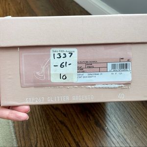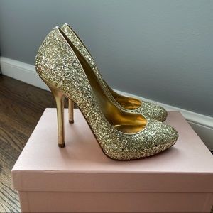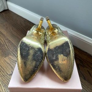 Fun gold glitter stiletto heels. Worn a few times, great condition. Bottom has normal wear from wearing and walking. Worn less than 5xs, maybe less. Holding on to them because they are beautiful and fun. It’s time to let go and have someone else love them.