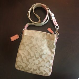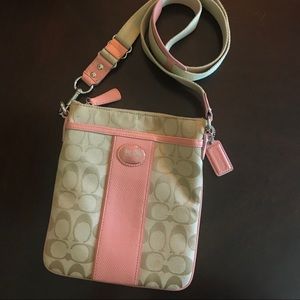 Gently used Coach crossbody bag in pink and khaki. Pocket in front and in back of bag. Great condition.