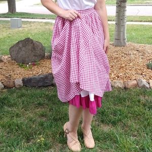 Layered cotton 1950's midi skirt! "Sid Harris" brand, in raspberry and white gingham, the lining is white with a raspberry ruffle. Side unpainted metal zip closure, and button waist. Fits approximately S, waist measures 27", and it's 30" long. Excellent condition, clean and ready to go!