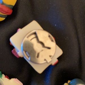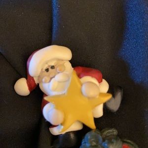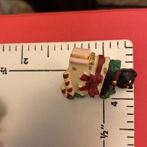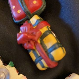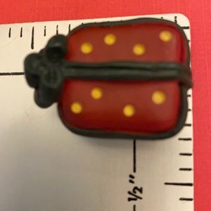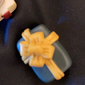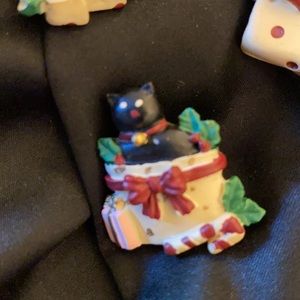 Vintage Christmas button covers are so darling! And, the kitty gift box pierced earrings are precious. The button covers and pierced earrings are made of a composite plastic. The button attachments are metal.