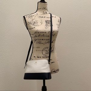 Kate Spade Southport hanna crossbody purse bag. Bag is a cream and dark navy color (almost black). Made of a pebble leather. Measures approx. 9x6.5x3. In overall great condition.