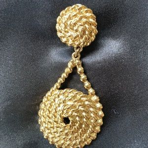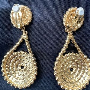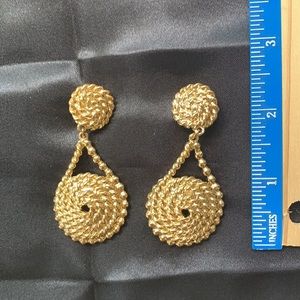 Vintage- shiny clip on gold tone drop earrings with rope swirled design. No name stamped on them. Came from a jewelry store originally. Show no signs of discoloration or tarnish.