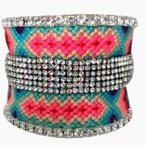 A colorful friendship bracelet sparkles with rows of rhinestones for luxe boho style.
