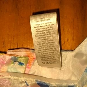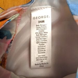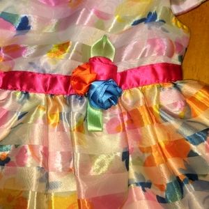 Multicolor dress with pretty rose on waistline. Buttons in the back with a cute little tie bow. Lightly warm look good condition.