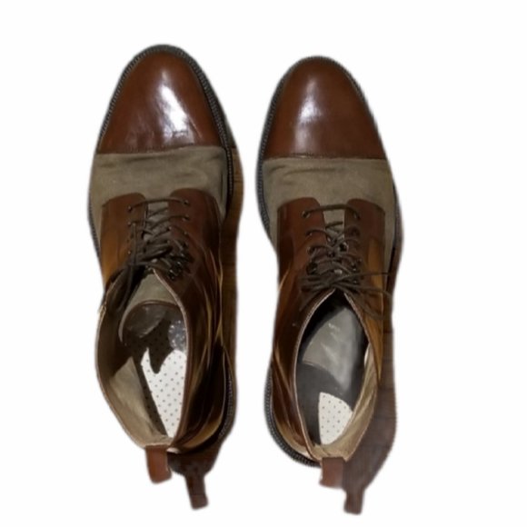 RARE FIND!! Custom-made in Italy by IDEA, Men's Brown Leather & Khaki/Tan Canvas Boots with gorgeous patina in Size 45EU = Men's Size11.5/12. Cap toe & Shaft in Leather, Uppers in Canvas. IDEA is an Italian Custom Shoe company that makes Limited Edition Designs & only ships to the US, UK & Europe.