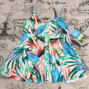 A vibrant tropical print blooms on this V-neck tankini top from Swim Solutions, styled with supportive underwire and adjustable shoulder straps.