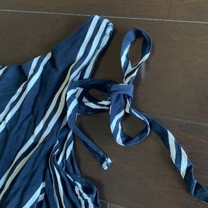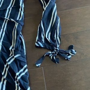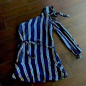 Fun and flirty navy blue and white stripped dress from Zara, belt to tie around, one shoulder, the long sleeve has an open shoulder and ties on the shoulder and also ties at the end on your wrist. Worn under 10 times.