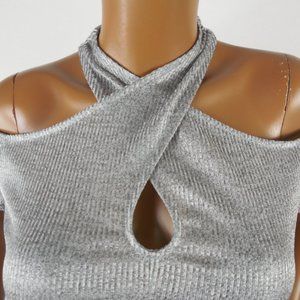 INC Top M NWT Silver X-Neck Shirt Stretch Short Sleeves Party Club Blouse