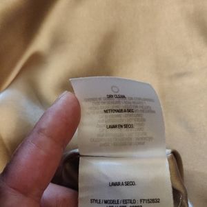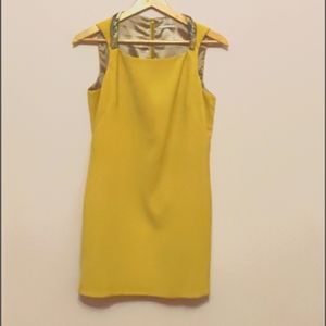 Tahari lemon-yellow sleeveless mini dress.Silk neckline with snake print.