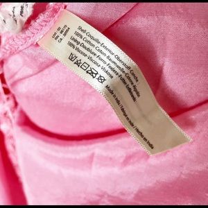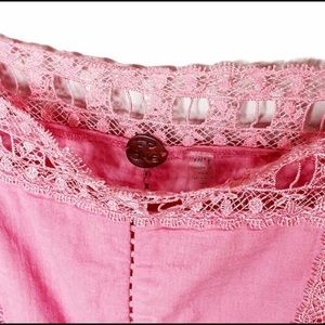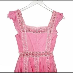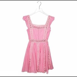 Pink mini dress by Free People. Lace crochet detailing. Smocked sides. Raw trim hem. Lined. Excellent preowned condition.