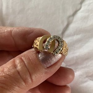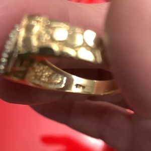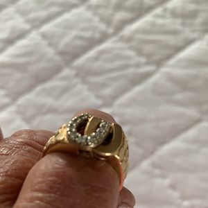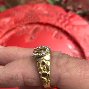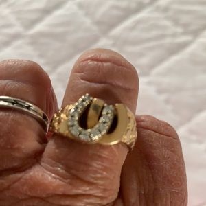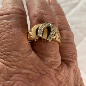 ESTATE PIECE, 14K GOLD NUGGET HORSESHOE RING WITH 10 DIAMONDS . DATED AROUND 1972, EXCELLENT CONDITION AND QUALITY. ONE HORSESHOE PLAIN CRISSCROSS THE DIAMOND HORSESHOE. UNISEX RING, MAN OR WOMAN, ONE OWNER. VERY UNIQUE PIECE, ESTATE ESTIMATE 1400.00
