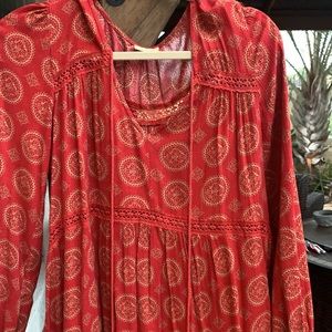 Fun and flirty babydoll dress perfect for your next festival or concert! Throw on your boots or lace up sandals for the perfect Match up with this very light weight and comfortable dress. Red with Gold design and lace accents along with a fun tassel rope that drapes from the neck.