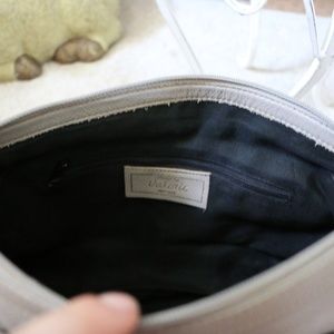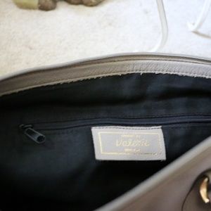 It is in relatively good condition with wear on the bottom of the bag and near the zipper. It is made out of genuine leather on the outside and a cloth interior. There is only one zippered pocket inside.