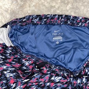 Nike multi-colored blue, black, pink, & white printed running shorts. Has lining and a small pocket on the inside. Drawstrings to adjust waist