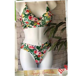 YGB"s Tropicana Bikini Pair is your go-to for sunkissed days and flirty escapes. Designed in a bold tropical print bursting with lush greens, punchy pinks, and golden yellow accents, this bikini brings all the island energy with a polished twist. The V-neck top features adjustable straps for a just-right fit, while the high-cut bottoms give legs for days and a cheeky silhouette that flatters from every angle.