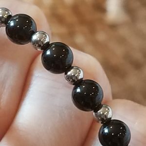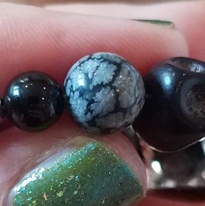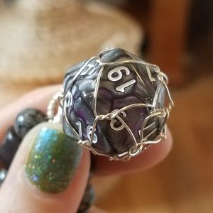 A shimmery marbeled black, grey and purple D20 role playing dice, securely caged in 24 gauge tarnish resistant bright silver wire. Skull carved black turquoise beads, grey and black snowflake obsidian beads, shiny black tourmaline beads and stainless steel spacer beads. Stainless steel hardware and lobster clasp. 1.5" extender.