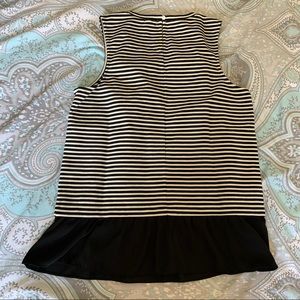 This navy and white striped top from J. Crew has a navy ruffle around the bottom. It is in excellent used condition. The striped part has stretch, so it’s very comfy.