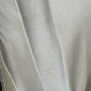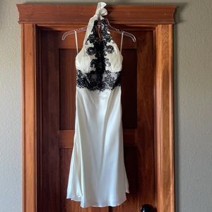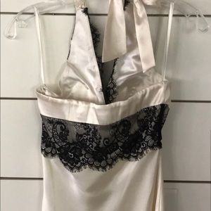 WHBM Cream satin lined dress with black lace and bead halter dress size 4. Has a stain in the skirt as pictured that’s not glaring when worn. Built in bra and could fit up to a size 8. Worn at one wedding. A stunning dress.