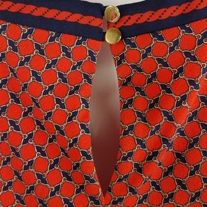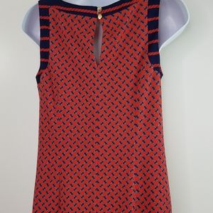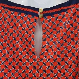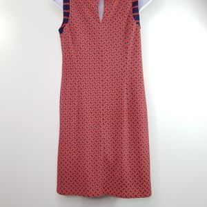 Euc red and navy blue sleeveless shift dress with keyhole opening at back. Fully lined, pullover style. Some scratches on gold-tone buttons.