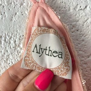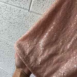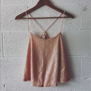 Over peach sequined, trapeze strapped top by Alythea sz: Small. Bust measured from pit to pit is 19”, length from top shoulder to bottom hem is 21”.