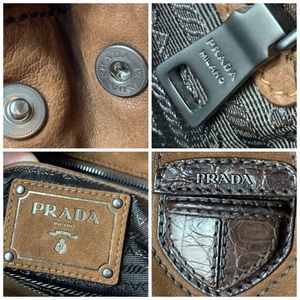 SOLD! Serial#LN 07421 PRADA authentic large tote chocolate color purse bag. 16” L, 8” H, 6” W. velvety soft goatskin tanned leather. Flap magnetic closure, Prada logo & genuine crocodile leather detail , Prada Milano on inside flap. Antiqued pewter logo hardware. Side leather logo triangle. Clean interior is logo lined + leather/metal logo bar, inner zip pockets & slide pockets. Backside pocket. Front has a light obscure spot, Bottom has darkened spot. Bottom protective logo metal embossed feet.