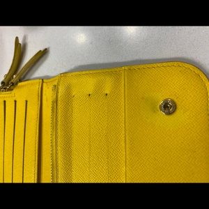 Clutch unsnaps to a light yellow leather interior with card slots, patch pockets and a wrap around zipper pocket.