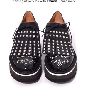 Patent leather shoes with silvertone studded accents. Features round almond toe, stud detailing and lace-up closure. Lightly padded leather insole. Heel height 2.5", platform height 1.75". Removable fringed kilt for ultimate versatility.