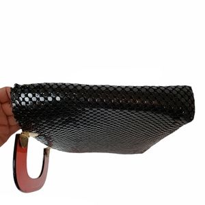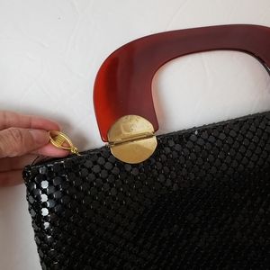 Vintage black metal square bag with brown plastic handles. Black lining and multiple pockets inside. This is a vintage item and it does show some wear mainly the gold hardware. Please see pics. Still in very good condition and comes from a smoke free home.