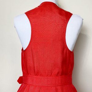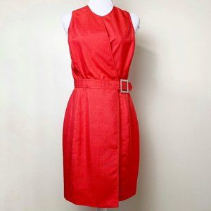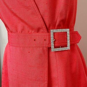 Gorgeous vintage tomato red wrap dress from Isaac Mizrahi featuring a round neckline, defined waist, and rhinestone side buckle. This stunning dress is 100% silk and is from the 1996 collection. Excellent preowned vintage condition.