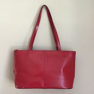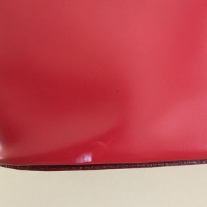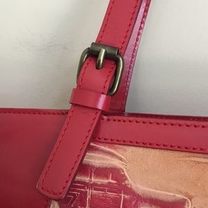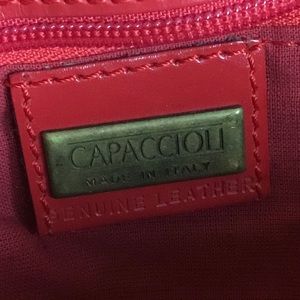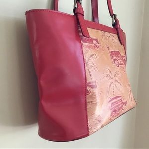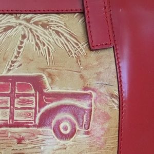 Very good used vintage condition. Red leather vintage Capaccioli shoulder bag with tan leather front featuring tricks, surf boards and palm trees. Inner lining is in good condition. Exterior has some scattered marks as pictured. Measures approx 14” x 8”