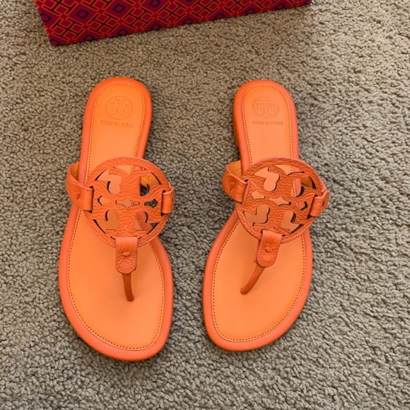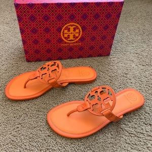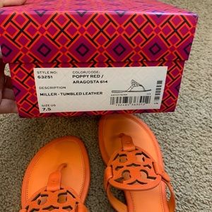 Only size 8 left. Brand new Tory Burch Miller Sandal. AUTHENTIC. Comes in original box from Tory Burch. Color: Poppy Red/Aragosta. Fast shipping. No bundling.